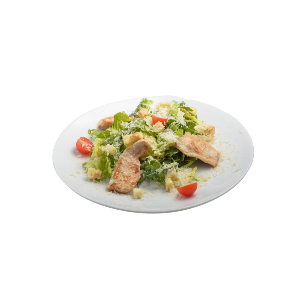 Pyszna sałatka CEZAR z boczkiem i grzankami, albo sałatka strips z naszymi specjałami.